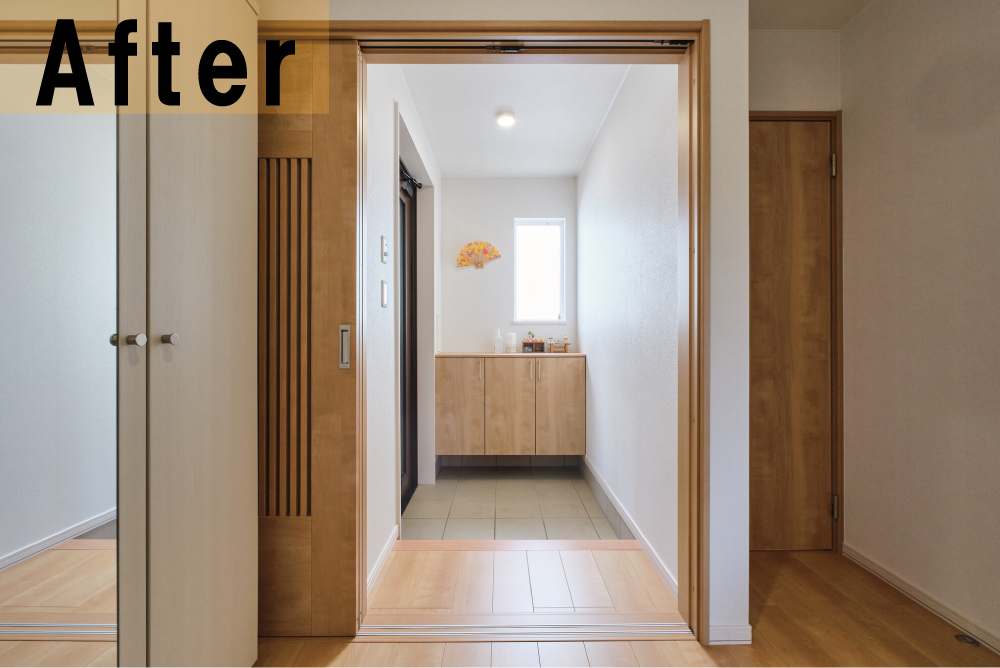 施主様のご希望にそって、できるだけ元の間取りを活かす形で、断熱・回遊動線・居間の段差解消・玄関やトイレの配置・デザインなど、細部を整えながら快適性を高めました。
